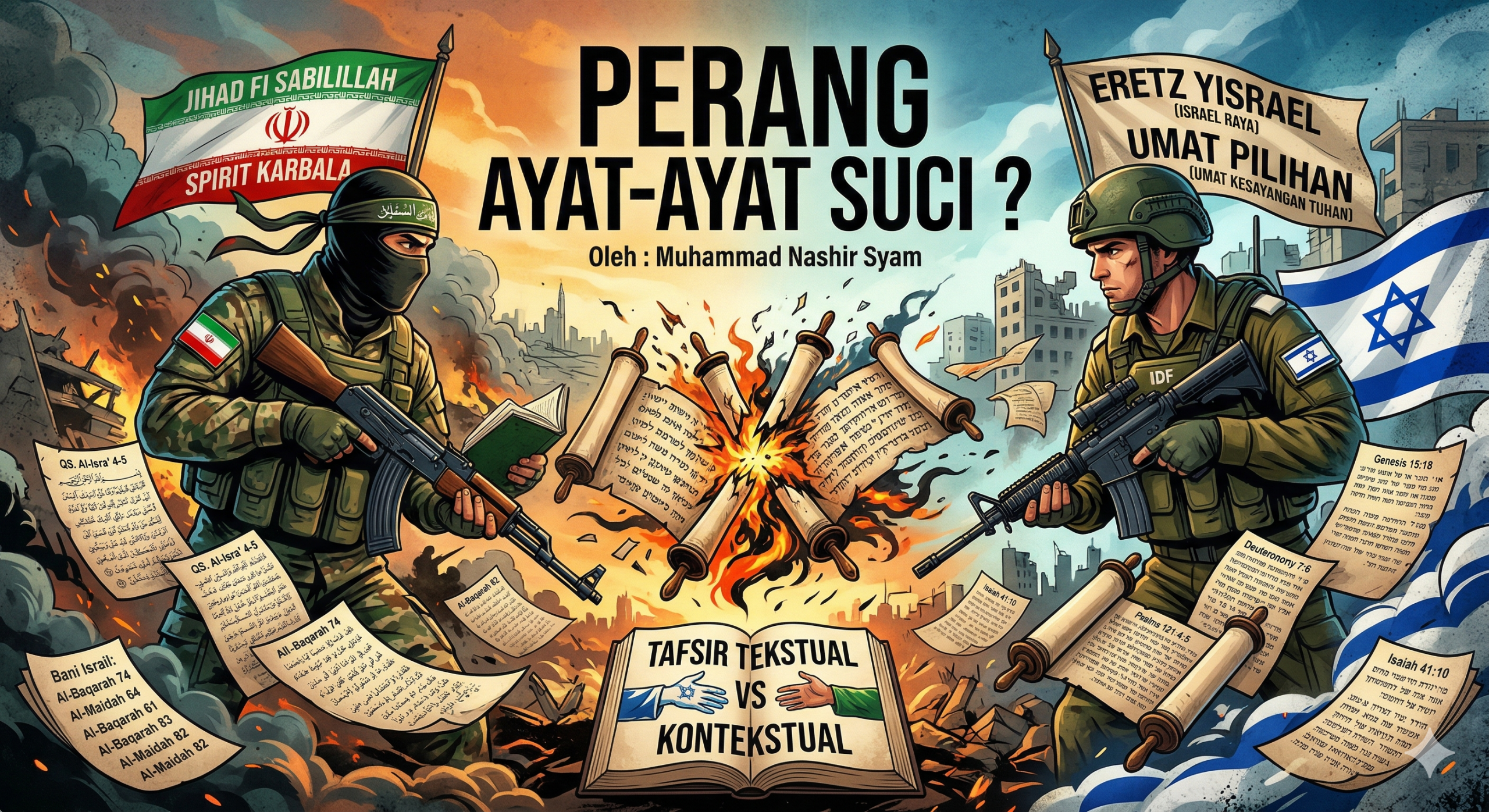Sekalipun para pengamat geopolitik mengatakan bahwa perang Iran versus Israel Amerika tidak ada hubungannya dengan masalah agama, akan tetapi tidak bisa dipungkiri kedua belah pihak tetap menjadikan simbol-simbol agama sebagai basis kekuatan mereka dalam menegakkan “kebenaran” sesuai dengan versi mereka masing-masing.